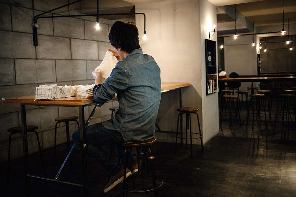 每晚幾乎都在這張桌子寫日記,這位店員正在折擦餐具用的布。