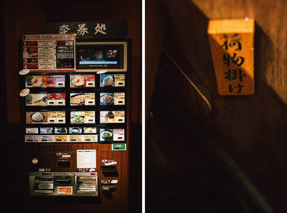 左 : 點餐機 / 右 : 拉麵店裡小小個人座下附了掛勾可放隨身物品