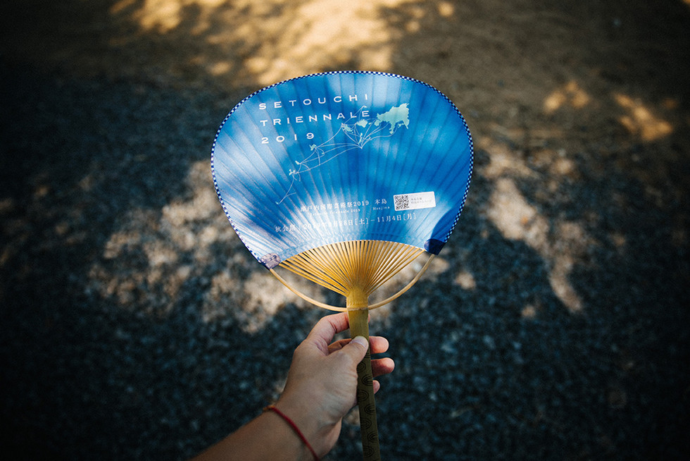 藝術祭行程裡有一本集章本,有些會有工作人員在展覽入口驗票蓋章,有些戶外的展覽品會把章放在旁邊自己蓋。自已集點蓋章特別有趣,像是小時候收集印章的回憶。藝術祭位於日本最大的團扇產地香川縣,活動官方也在 (某個) 島上,提供印上島上資訊的免費團扇,在春夏季的展季裡真的好實用啊! 真是熱昏了!